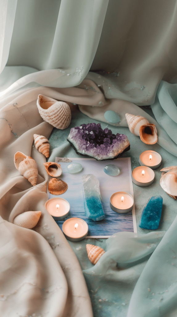 - Create a Pisces Altar: Include seashells, candles, amethyst, aquamarine, and images of the ocean.