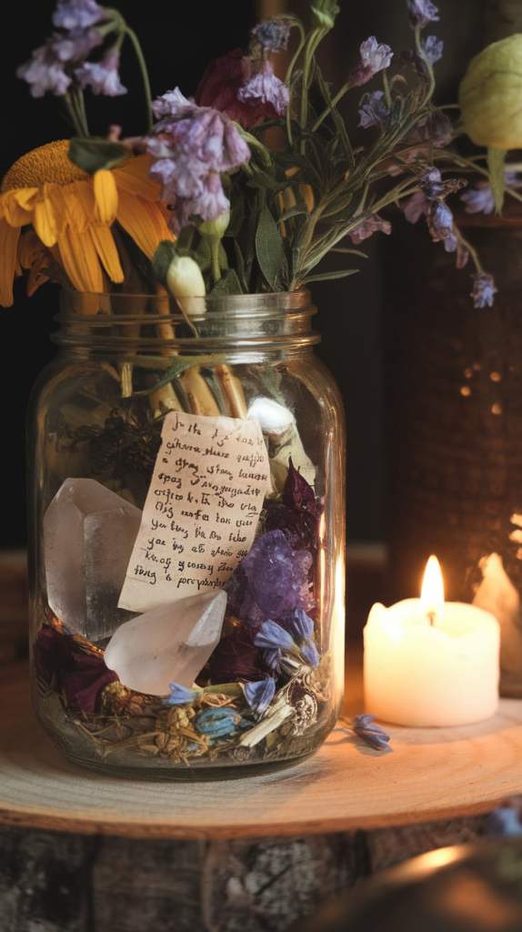 Fill a small jar with herbs, crystals, and symbols that align with your goals for the season. Seal it with wax and keep it on your altar as a magical reminder of your intentions.