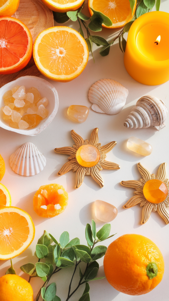 - Crystals: Sunstone (joy), carnelian (creativity), tiger’s eye (protection), garnet (passion).