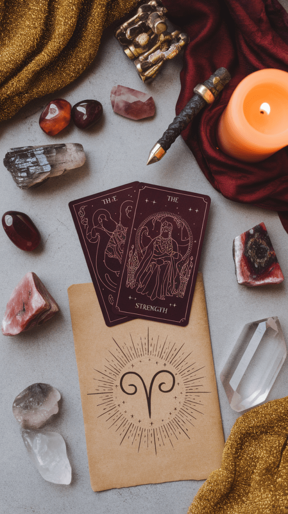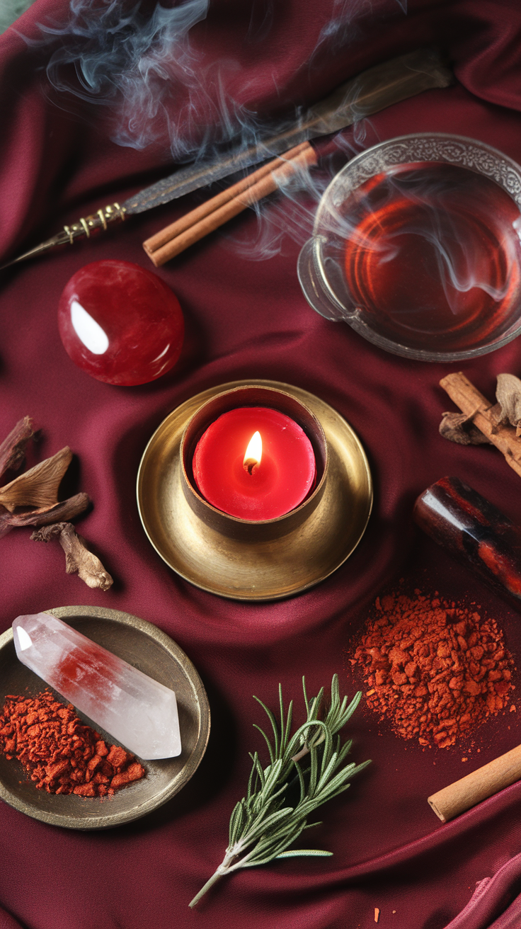 - Crystals: Carnelian (courage, motivation), Red Jasper (strength, grounding), Clear Quartz (amplification), Bloodstone (bravery, vitality)