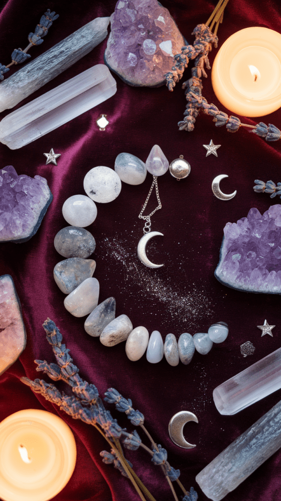 Crystals are a cornerstone of lunar witchcraft, with specific stones aligning to the moon’s energy:
