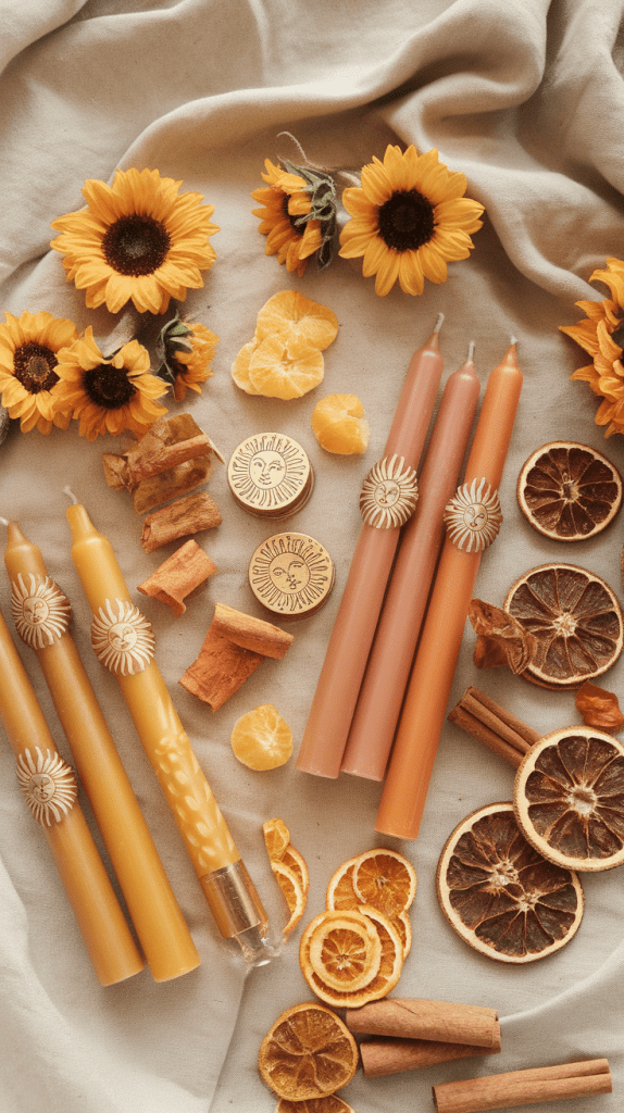 - Create a sun altar – Decorate with yellow and gold candles, sun symbols, and fresh flowers.