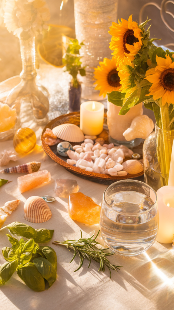 Decorate your altar with symbols of summer, such as sunflowers, seashells, oranges, and candles in shades of gold and yellow. Add items that represent abundance and growth.