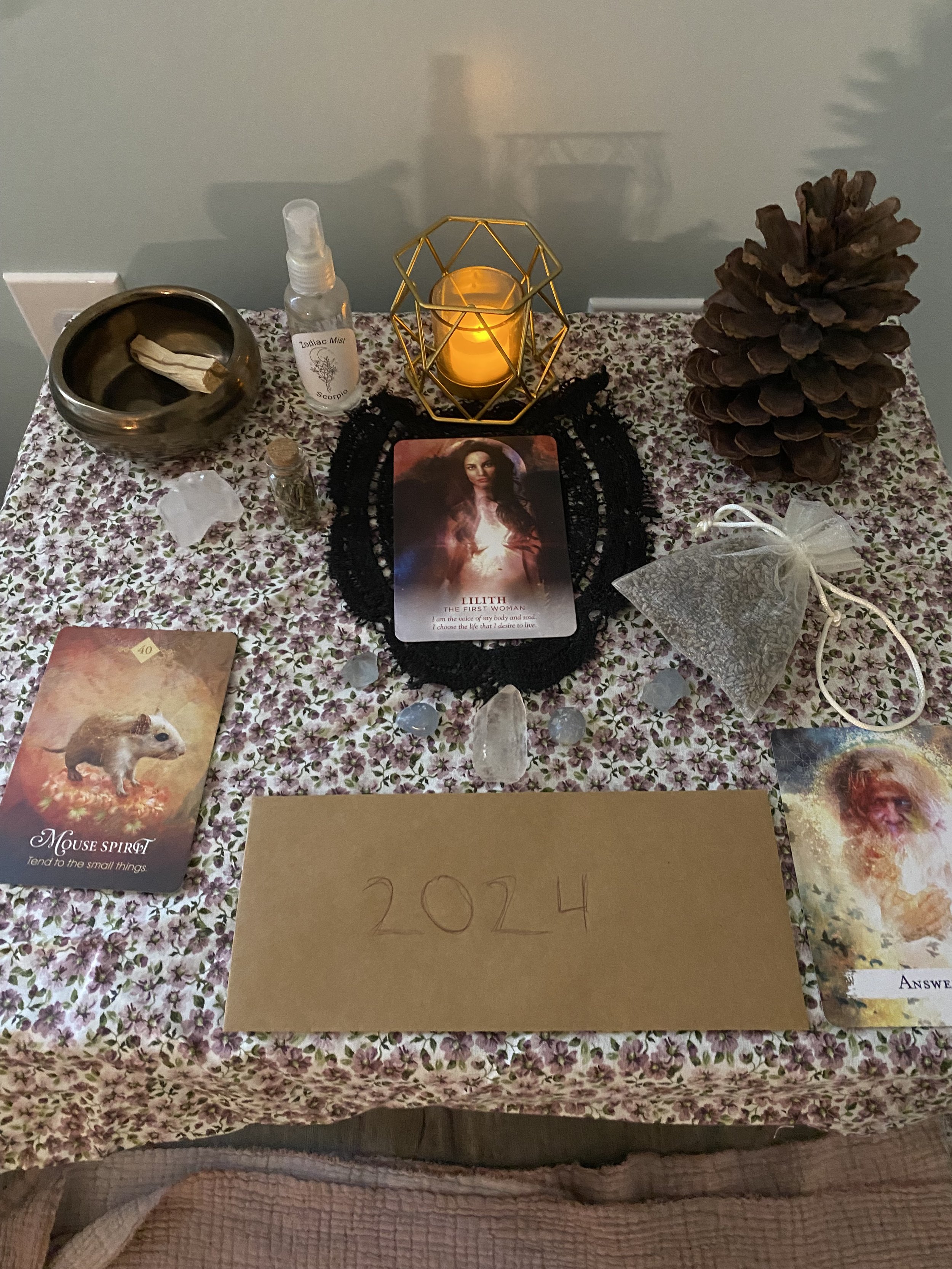 - Create an Altar: An altar serves as a beautiful sacred space to connect with your intentions. Pick a place in your home (or even digitally if you’re tight on space/don’t want an altar out), and decorate it with pieces that mean something to you. Don’t overthink it – whatever calls to you is perfect. On my 2024 altar I’ve place my goddess of the year, animal of the year, a card to embody, some crystals that called to me, items to represent air, fire, earth, and water, as well as a few items that I was intuitively called to adding.