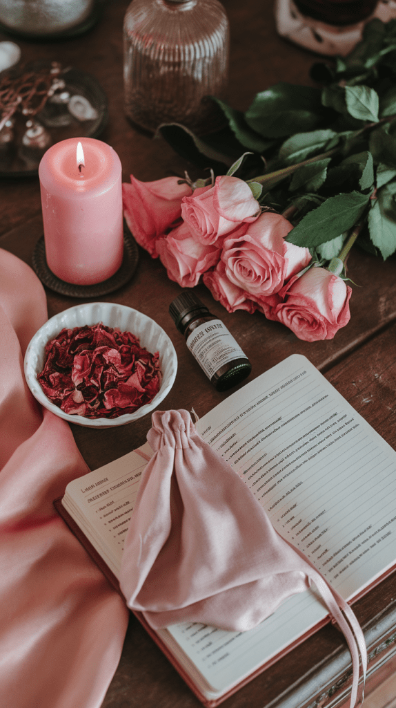 Place rose quartz and a pink candle on your altar. Write a love affirmation (for self-love or attracting love) and place it under the candle. As it burns, visualize your heart filling with love and warmth.