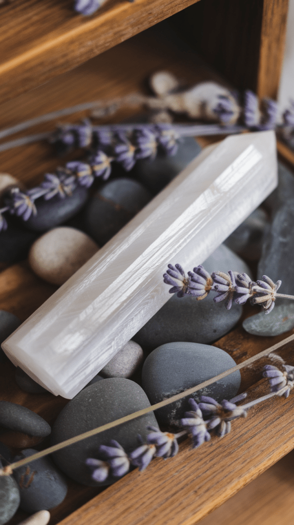 Selenite is one of my favorite crystals for maintaining a clear, high-vibration atmosphere. Its luminous white energy acts like a spiritual cleanser, removing stagnant energy and promoting mental clarity.