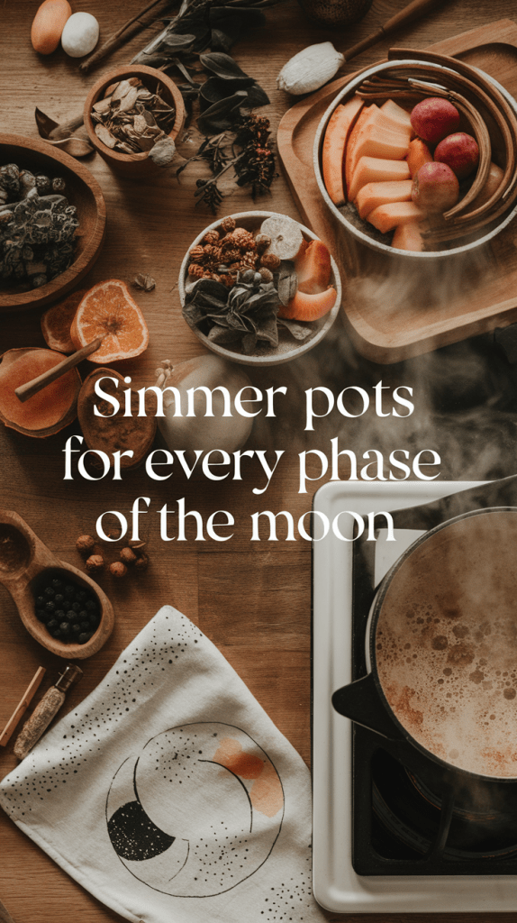 Harnessing the energy of the moon is a beautiful way to align your intentions with nature’s rhythm. Simmer pots can enhance your lunar rituals, filling your home with enchanting scents while supporting your spiritual goals. Below, you’ll find simmer pot recipes tailored to each of the moon’s eight phases, complete with intentions, correspondences, and crystals to enhance your practice.