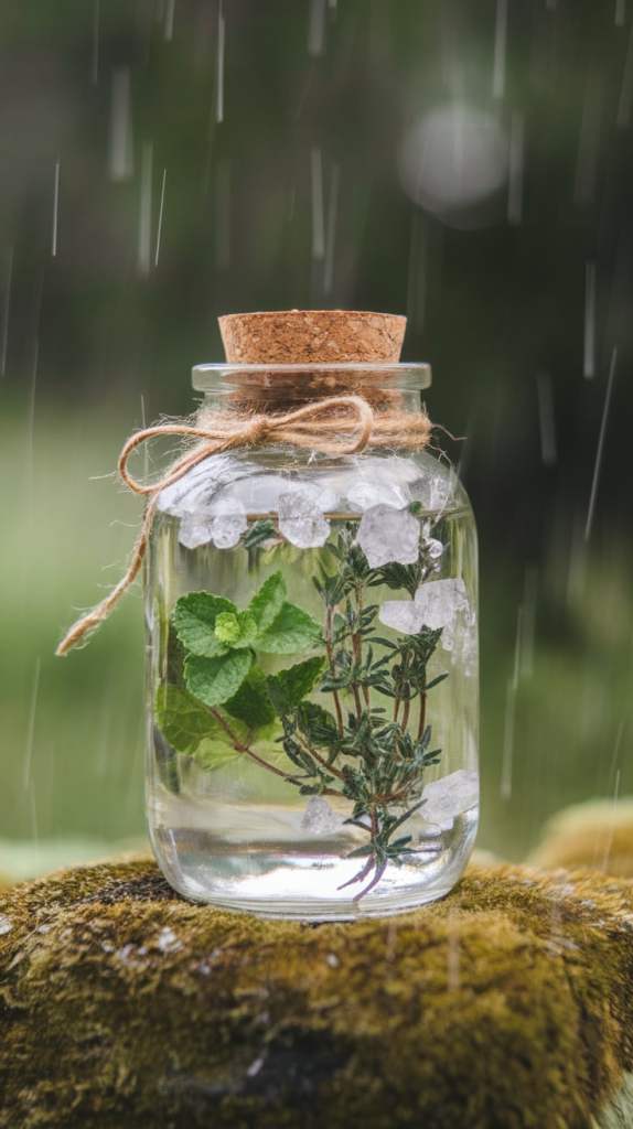 Capture rainwater in a small jar, seal it with a lid, and add herbs like mint or thyme for cleansing and renewal. Use it to bless your space or altar.