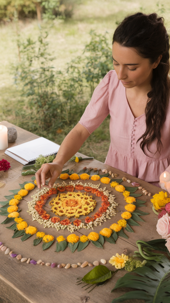 Arrange petals, leaves, and small stones into a mandala. As you work, set an intention for balance and harmony.