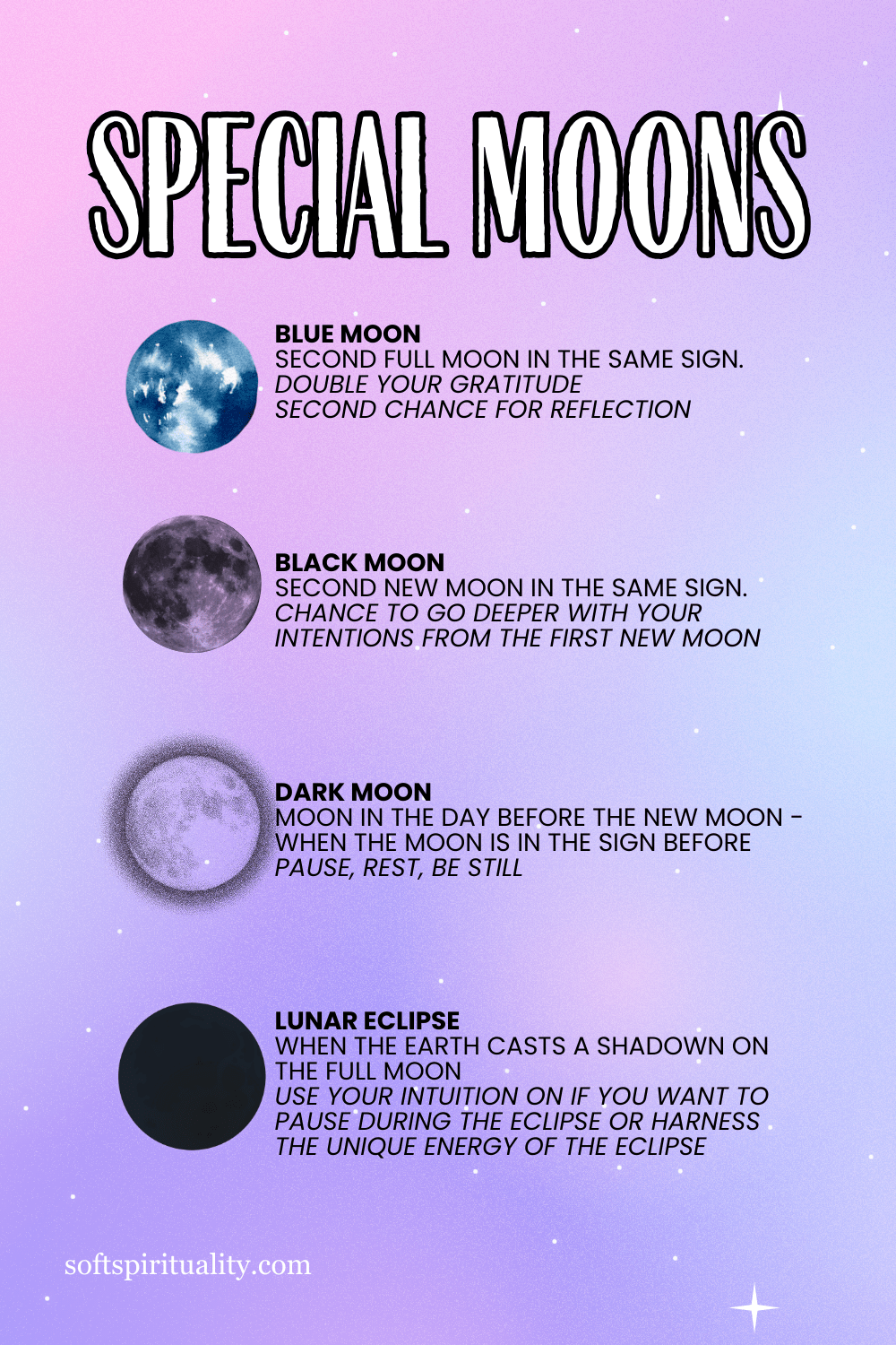If you’re working with the moon or have ever followed the moon you probably know at least two phases: the New Moon and the Full Moon. If you’ve been working with it for a while you might have even attuned to all eight phases: New Moon, Waxing Crescent, First Quarter Moon, Waxing Gibbous, Full Moon, Waning Gibbous, Last Quarter Moon, and Waning Crescent. And you might’ve connect with the names of each full moon – but did you know there’s a few more types of moons? Here’s a list of the moons you might not have started working with yet. If these don’t resonate with you or your lunar practices, don’t worry about it – but these special events might be something that you want to keep in your back pocket for a little extra boost when working with the moon.